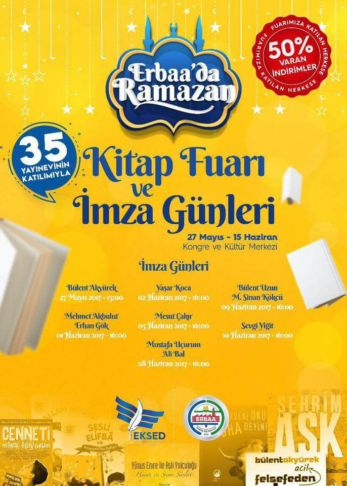 Erbaa Belediyesinin Ramazan Etkinlikleri kapsamında 35 yayın evi ve binlerce kitabın sergileneceği kitap fuarı bugün açıldı.. “İçinizdeki Öküze Oha Deyin” adlı kitabın yazarı Bülent Akyürek’in imza günüyle açılışı gerçekleştireceği fuar 20 gün boyunca devam edecek.