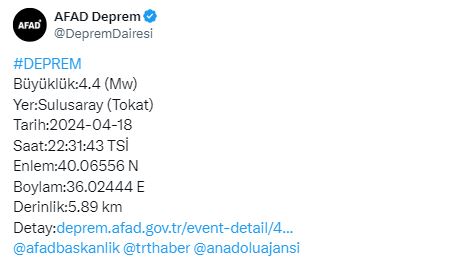 Afet ve Acil Durum Yönetimi (AFAD) Başkanlığı'nın sosyal medya hesabından yapılan paylaşıma göre, saat 22.31'de merkez üssü Sulusaray ilçesi olan 4,4 büyüklüğünde sarsıntı kaydedildi.