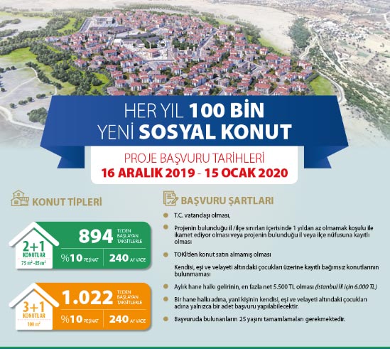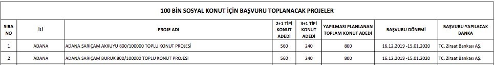 Dar gelirli ailelerimizi ev sahibi yapacak “100 Bin Yeni Sosyal Konut” projesinin başvuruları başladı. Cumhurbaşkanı Recep Tayyip Erdoğan: "Bu konutlar 2+1 brüt 75 ve 85 metrekare ile 3+1 brüt 100 metrekare olarak projelendirilecektir. Bu konut projeleri geleneksel mahalle kültürümüzü yaşatacak şekilde tasarlanacaktır."Cumhurbaşkanımız Sayın Recep Tayyip Erdoğan'ın himayelerinde, Çevre ve Şehircilik Bakanlığımızın koordinasyonu ve Hazine ve Maliye Bakanlığımızın destekleriyle üretilecek "100 Bin Yeni Sosyal Konut" için başvuru işlemlerinizi Dijital Türkiye Portalı üzerinden gerçekleştirebilirsiniz. TOKİ Adana sosyal konut projesi kapsamında Adana Sarıçam Akkuyu 800 konut, Adana Sarıçam Buruk 800 konut yapılacaktır.