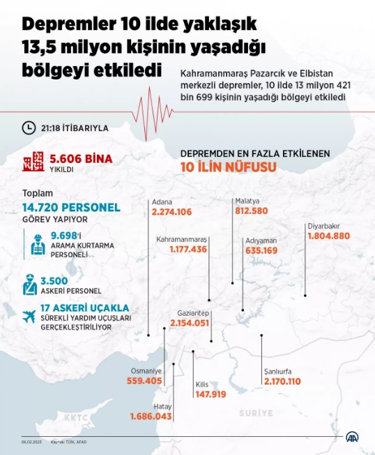 10 ili etkileyen Kahramanmaraş Pazarcık merkezli 7.7 büyüklüğünde ve Elbistan Merkezli 7.6 büyüklüğünde iki deprem sonrasında 1509 artçı depremle 6 bin 444 binanın çöktü ya da ağır hasar aldı.
