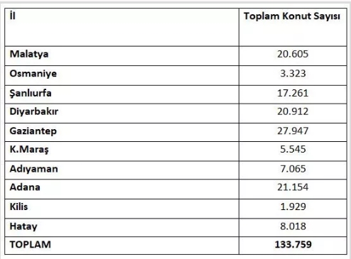 TOKİ depremin merkezi Kahramanmaraş'ta 5 bin 545, Hatay'da 8 bin 18, Osmaniye'de 3 bin 323, Malatya'da 20 bin 605, Şanlıurfa'da 17 bin 261, Diyarbakır'da 20 bin 912.