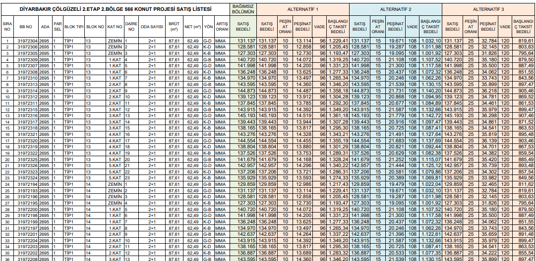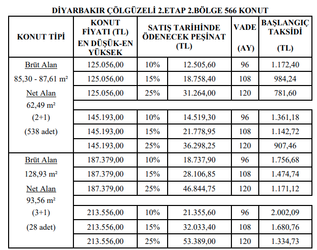 Toplu Konut İdaresi Başkanlığı Diyarbakır Kayapınar konut satışlarına ilişkin satış duyurusunda şu ifadeler yer almata. Diyarbakır Çölgüzeli 2.Etap 2.Bölge 566 Konut Projesi Toplu Konut Uygulaması kapsamındaki 566 adet konut; ön şartsız, kurasız başvuru önceliğine göre konut alma ve seçme olanağı ile Çevre ve Şehircilik Bakanlığı adına Açık Satışa sunulacaktır. Açık Satış Yöntemiyle satışı gerçekleştirilecek konutların başvuruları, 28 Kasım – 31 Aralık 2018 tarihleri arasında ilgili bankanın yetkili tüm şubeleri tarafından kabul edilecektir. Konutların satış fiyat ve koşulları ilgili banka Şubelerinde Toplu Konut İdaresi Başkanlığı web sayfası www.toki.gov.tr aracılığıyla duyurulmaktadır.