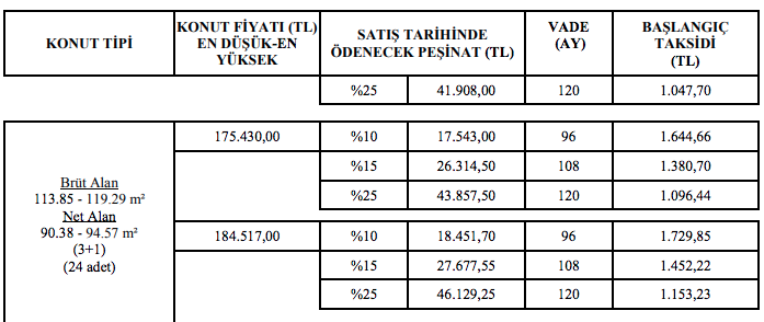Konutların satış fiyat ve koşulları ilgili banka Şubelerinde ve Toplu Konut İdaresi Başkanlığının web sayfası (www.toki.gov.tr) aracılığıyla duyurulmaktadır. En düşük ve en yüksek fiyatlar ile alternatifli ödeme koşulları aşağıda sunulmaktadır.