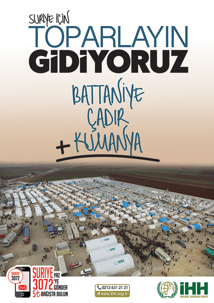 “Toparlayın Gidiyoruz” sloganı ile bu kez de Türkiye sınırına sığınan binlerce Suriyeli için seferber oluyor ve onların şu an için en çok ihtiyaç duydukları "Battaniye, Çadır ve Kumanya" için yola çıkıyoruz.