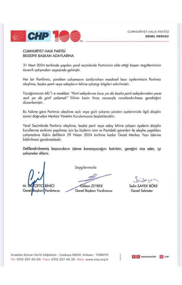CHP Genel Merkezi tarafından yayınlanan genelgede parti içindeki muhaliflerin ihracına başlanacağı bildirildi.