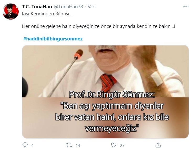 Fatih Altaylı'nın 'tüm Türkiye'nin tanıyıp saygı duyduğu Prof.' diyerek güzellediği Bingür Sönmez, sürecin en başından bu güne kadar 'felaket tellalığı'na soyunarak halka korku pompalayanlardan birisi oldu. Prof. Sönmez, 28 Mart günü yaptığı açıklamasında, 'Büyük bir felakete gidiyoruz' ifadelerini kullanarak hastalığı yaymak konusunda umrecileri suçlamıştı: "Ama biz umreden dönenleri kontrol etmedik. Oralara gittiler ve hastalığı yaydılar"