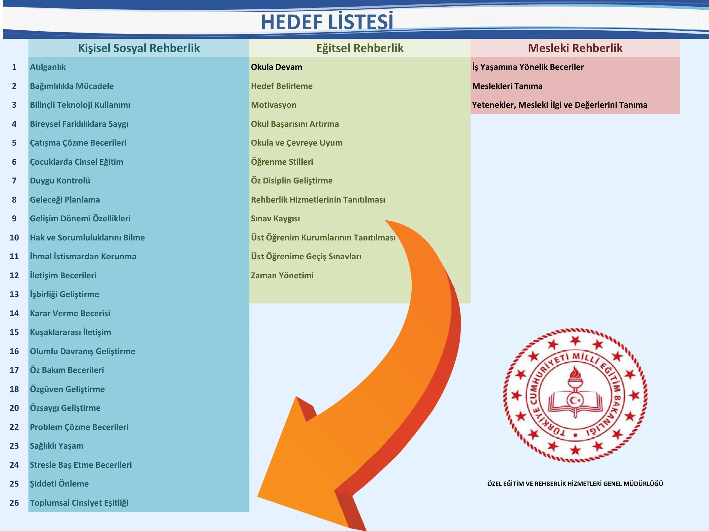 MEB Özel Eğitim ve Rehberlik Hizmetleri Genel Müdürlüğü’nün hazırladığı listede okul idaresinin TCE’yi seçmesi durumunda, yıl boyunca Toplumsal Cinsiyet zırvasının öğrenciler arasında yaygın hale getirilmesi için çalışma yürütülmesi zorunlu oluyor. Rehber öğretmenlerin sürdürdüğü “hedef” uygulaması okuldaki tüm öğrencileri kapsıyor.