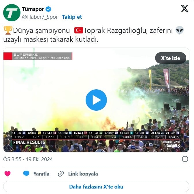 Milli motosikletçimiz Toprak Razgatlıoğlu, İspanya Jerez Pisti'ndeki yarışı 2. sırada tamamlayarak dünyanın en büyüğü oldu.