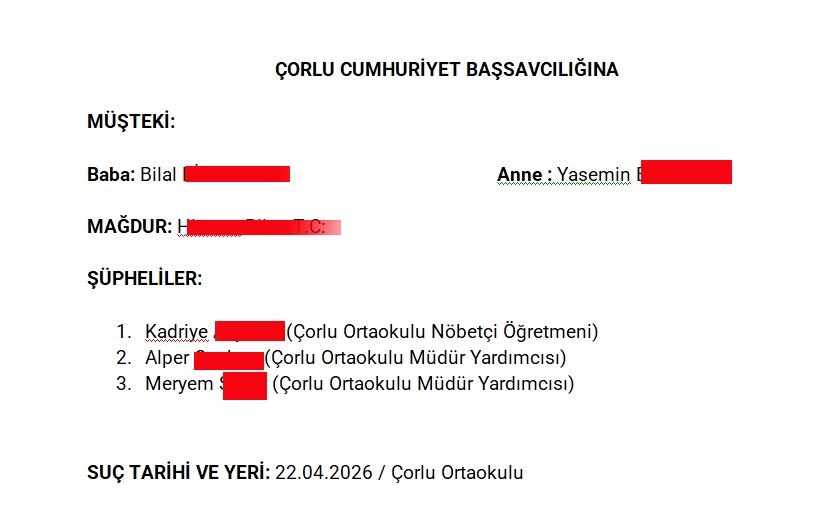 Tekirdağ’ın Çorlu ilçesinde bulunan Çorlu Ortaokulu’nda yaşanan tören krizi yargıya taşındı. Henüz 7. sınıf öğrencisi olan H.B. isimli kız öğrencinin, 22 Nisan’da okulun son saatinde düzenlenen törene katılmak istemediği halde kolundan sürüklenerek zorla tören alanına götürülmesi ve disiplin suçu işlediği gerekçesiyle hakkında tutanak tutulması sebebiyle harekete geçen aile, Çorlu Cumhuriyet Başsavcılığı’na suç duyurusunda bulundu.
