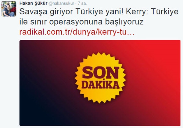 John Kerry'nin "98 kilometrelik kısmı Türklerle birlikte biz bir operasyona girerek kapatacağız" açıklaması sonrası bazı her fırsatta ülkesini karalayanlar yine harekete geçti. Hakan Şükür başta olmak üzere paralel örgüt müritleri "İşte savaşa giriyoruz" diyerek savaş çığlıkları attı. Ankara'nın "Kerry'nin kastettiği, daha etkin ve kuvvetli hava operasyonları..." açıklamasıyla paralellerin hevesleri kursağında kaldı.