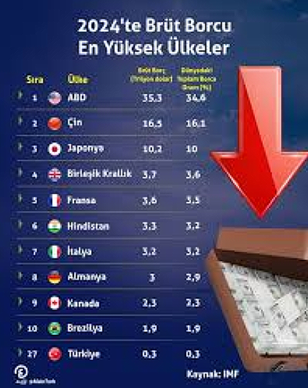 Çin’in nüfusu Amerika’nın dört misli olmasına rağmen, bu ülkenin ABD’den daha az borcu var: 17 trilyon dolar.. Ama nihayetinde o da ikinci sırada.