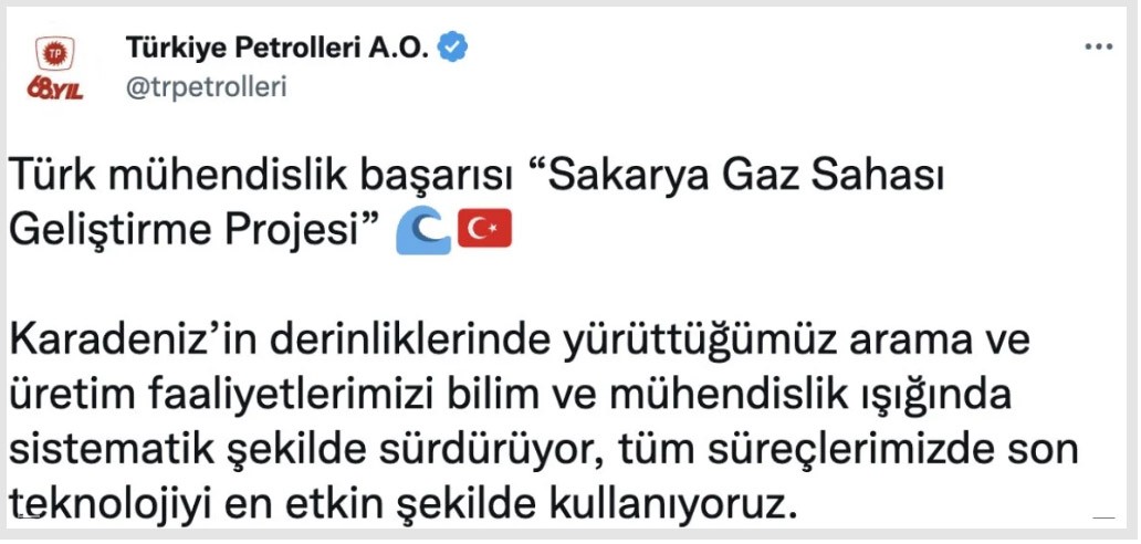 Türkiye Petrolleri Anonim Ortaklığı (TPAO), Sakarya Gaz Sahası'na ilişkin Twitter hesabından bir paylaşım yaptı. Paylaşıma, "Karadeniz’in derinliklerinde yürüttüğümüz arama ve üretim faaliyetlerimizi bilim ve mühendislik ışığında sistematik şekilde sürdürüyor, tüm süreçlerimizde son teknolojiyi en etkin şekilde kullanıyoruz." notu düşüldü.