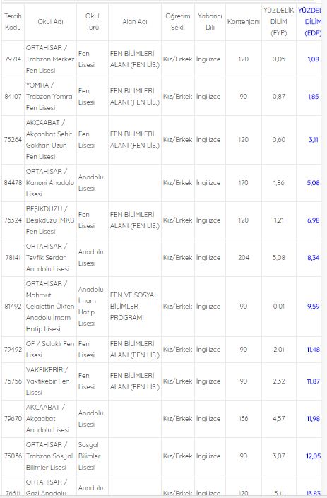 LGS 2018 sınav sonuçlarının açıklanmasıyla birlikte özel liselerin taban puanları ve yüzdelik dilimleri son dakika açıklandı. İyi bir lise hayali kuran 8. Sınıf öğrencilerinin liselerin taban puanları ve yüzdelik dilimleriyle kendi puanları ve yüzdelik dilimlerini karşılaştırıp ona göre tercih yapacaktır. İşte Trabzon liselerin taban puanları ve yüzdelik dilimleri MEB 3 Haziran’da yapılan Liselere Giriş Sınavı yani LGS sınav sonuçlarını dün sonuc.gov.tr adresi üzerinden açıkladı. 8. Sınıf öğrencilerinin girdiği LGS sınav sonuçlarına göre öğrenciler aldıkları puan ve elde ettikleri yüzdelik dilimler ile liselere tercihini yapacak. LGS sınav sonuçlarına göre öğrenciler LGS tercihlerini 2 Temmuz-13 Temmuz tarihlerinde yapılacak. LGS sonuçlarının açıklanmasıyla birlikte gözler liselerin taban puanları ve yüzdelik dilimlerine çevrilmişti. Trabzon Anadolu liseleri 2018 taban puanlarını ve yüzdelik dilim YEP puanlarını açıkladı. İşte Trabzon'daki liselerin taban puanları ve yüzdelik dilimleri.