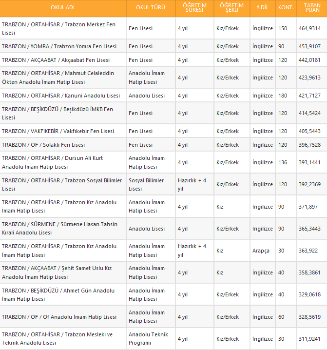 Trabzon liseleri taban puanı 2021, Trabzon liseleri başarı sıralaması ve liseleri kontenjanları nelerdir?