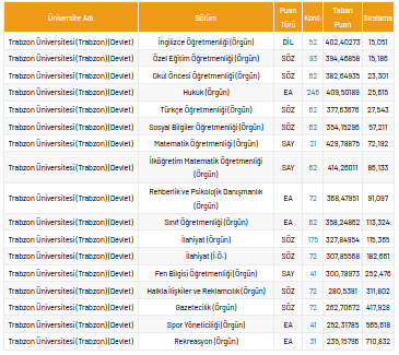 Trabzon Üniversitesi 2021 taban puanları ve yüzdelik dilimleri nelerdir?
