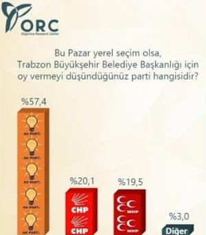 ORC Araştırmanın 31 Mart'ta yapılacak yerel seçimler için yayınladığı seçmen tercihi raporunu yayınladı. 14-31 Ocak tarihlerini kapsayan en güncel araştırmada Ankara seçmeninin %41.9'u Yansur Yavaş derken, seçmenlerin %36,8'i ise Mehmet Özhaseki'den yana oy kullanacağını açıkladı. Ankara Stratejik Planlama ve Araştırma Merkezi tarafından yapılan kamuoyu araştırmasına göre AK Parti'nin Ankara Büyükşehir Belediyesi Başkanı adayı Mehmet Özhaseki %47.4 oy oranına sahip iken, CHP'nin Adayı Mansur Yavaş %42.4 oy oranında gözüküyor. Ankete katılan 4200 kişi ile yapılan görüşmeler sonucu % 10.3 oranında seçmenin kararsız olduğu gözüküyor. Gezici Araştırma şirketinin yedi büyük şehirde yaptığı yerel seçim anketine göre ise Ankara Büyükşehir Belediye Başkanlığı için ilk sırada yüzde 52,2 ile AK Parti + MHP Cumhur İttifakı’nın AK Parti adayı Mehmet Özhaseki, ikinci sırada da yüzde 47,8 ile CHP + İyi Parti Millet İttifakı’nın CHP'li adayı Mansur Yavaş bulunuyor. Konsensus Araştırma ve Danışmanlık Şirketi de 31 Mart 2019 yerel seçimlerine ilişkin yaptığı son kamuoyu araştırmasının sonuçlarını açıkladı. Konsensus İstanbullulara, "Bu pazar bir yerel seçim olsa İstanbul Büyükşehir Belediye Başkanlığı için hangi siyasi partiye oy verirsiniz?" sorusunu yöneltti. Anket sonucuna göre, araştırmaya katılanların yüzde 44,3'ü AK Parti'ye, yüzde 41,6'sı CHP'ye oy vereceklerini belirtti. Katılımcıların yüzde 6,1'i kararsız. Anket şirketlerinin Trabzon yerel seçim sonuçlarına ilişkin verilerini açıklamadı. Ancak ORC araştırma daha önceden Trabzon yerel seçim anket sonuçlarını açıklamıştı.
