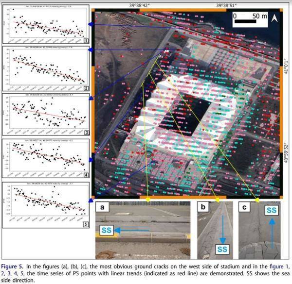 Kentte deniz dolgusu üzerine araştırmalar yürüten Karadeniz Teknik Üniversitesi (KTÜ) Mühendislik Fakültesi Harita Mühendisliği öğretim üyesi Prof. Dr. Ertan Gökalp ile Muğla Sıtkı Koçman Üniversitesi Yatağan Meslek Yüksekokulu Mimarlık ve Şehir Planlama Bölümü öğretim üyesi Fırat Altıntaş'ın uluslararası dergide yayımlanan bilimsel makalesinde, Avrupa Uzay Ajansı’na ait ‘Sentinel-1’ uydusundan elde edilen 3 yıllık verilere göre, dolgunun yılda 9,7 milimetre çöktüğü, bazı alanların ise yılda 3,9 milimetreye kadar yükseldiğine yer verildi. Araştırmada zemin çatlaklarına bağlı olarak oluşan deformasyonların dikey yönde ve çökme şeklinde olduğu, en yüksek deformasyonun ise stadyumun batısında görüldüğü belirlendi.