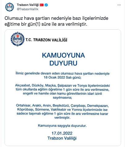 Trabzon'da yarın okullar tatil mi? 18 Ocak 2022 Salı Trabzon'da yarın okul var mı?