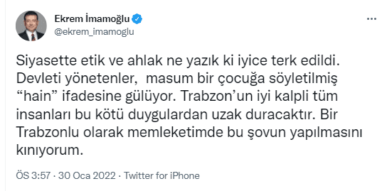 Devleti yönetenler, masum bir çocuğa söyletilmiş "hain" ifadesine gülüyor. Trabzon'un iyi kalpli tüm insanları bu kötü duygulardan uzak duracaktır. Bir Trabzonlu olarak memleketimde bu şovun yapılmasını kınıyorum.