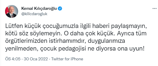 Kılıçdaroğlu'nun "Lütfen küçük çocuğumuzla ilgili haberi paylaşmayın, kötü söz söylemeyin." talimatına aldırış etmeyen İmamoğlu, "Siyasette etik ve ahlak ne yazık ki iyice terk edildi." dedi. İmamoğlu, terör sevicilerle iş kotaran genel başkanını şöyle savundu: