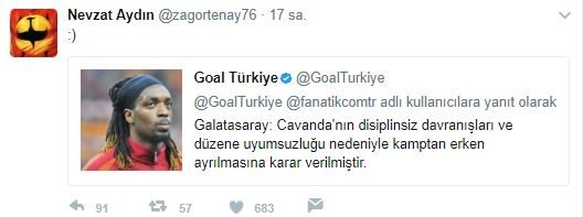 Trabzonspor yöneticisi Nevzat Aydın, Twitter hesabından futbolcunun kamptan gönderilme haberini alıntılayarak gülme emojisi koydu.