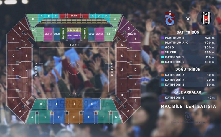 Kategori 6 (Kale Arkaları) 40 TL, Kategori 5 (Doğu 3) 60 TL, Kategori 4 (Doğu 2) 70 TL, Kategori 3 (Doğu 1) 80 TL, Kategori 2 (Batı 2 ) 100 TL, Kategori 1 (Batı 1) 110 TL, VIP Silver 250 TL, VIP Gold 300 TL, Platinum A-C Blok 400 TL, Platinum B Blok 425 TL.