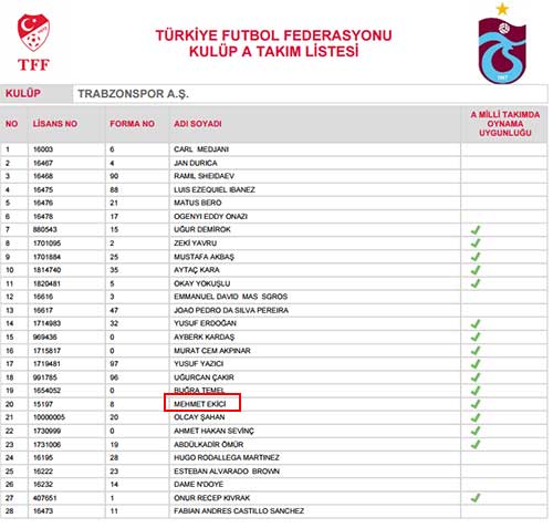 TFF'nin resmi sitesinden yayınlanan kadroda yeni transfer Mas, Pereira, Medjani, Olcay Şahan ve Hugo Rodallega'nın yanı sıra kadro dışı bırakılan Mehmet Ekici'nin de yer alması dikkat çekti.