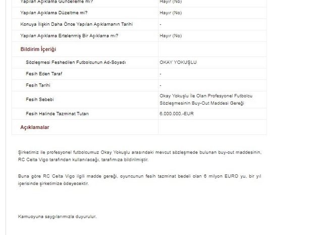 Trabzonspor, Okay Yokuşlu'nun 6 milyon Euro'ya Celta Vigo'ya transfer olduğunu KAP'a bildirdi.