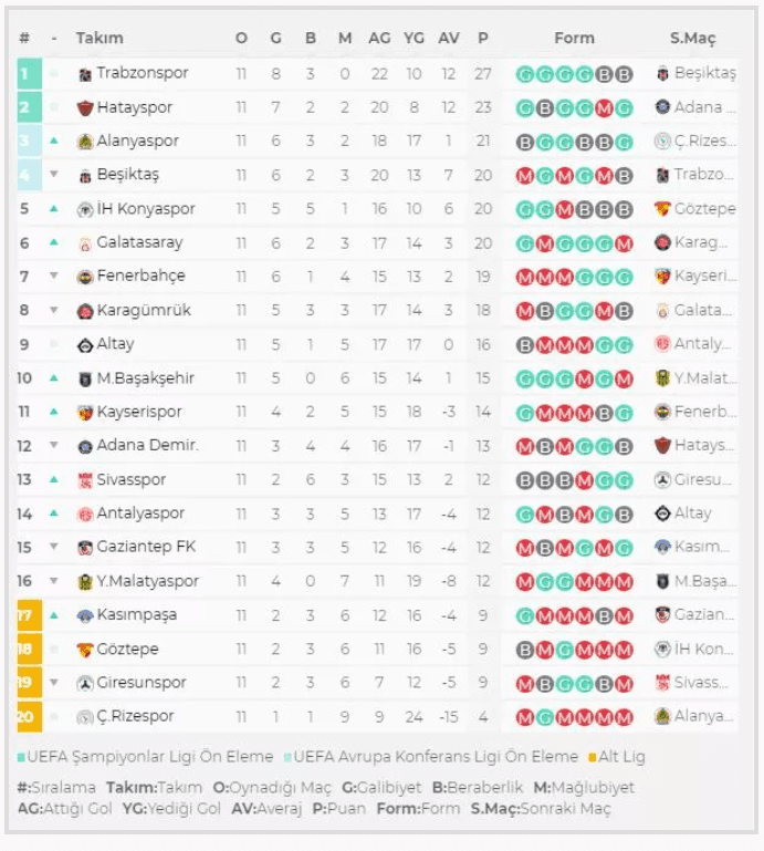 Süper Lig'de 11. haftayı kayıpsız geçen Trabzonspor, liderliğini devam ettirirken Beşiktaş ve Fenerbahçe'nin mağlup olduğu haftayı Galatasaray 3 puanla kapattı.