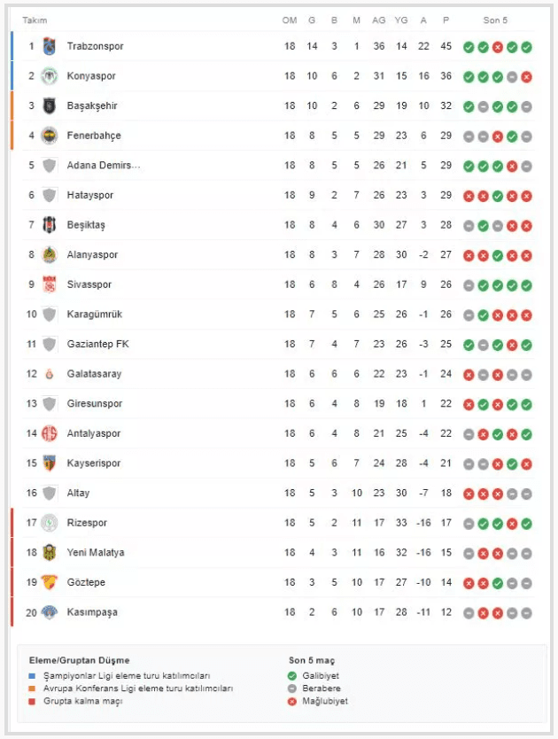 Süper Lig'de 18. hafta sona erdi. Altay'ı 2-1 yenen Trabzonspor liderliğini devam ettirdi.
