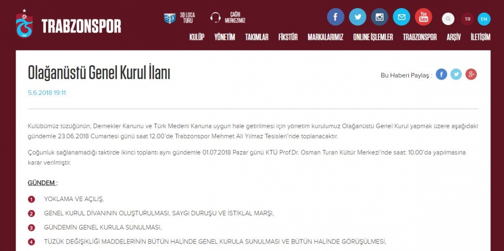 Genel Kurul yapmak üzere aşağıdaki gündemle 23.06.2018 Cumartesi günü saat 12.00’de Trabzonspor Mehmet Ali Yılmaz Tesisleri’nde toplanacaktır. Çoğunluk sağlanamadığı taktirde ikinci toplantı aynı gündemle 01.07.2018 Pazar günü KTÜ Prof. Dr. Osman Turan Kültür Merkezi’nde saat: 10.00’da yapılmasına karar verilmiştir” ifadelerine yer verildi.
