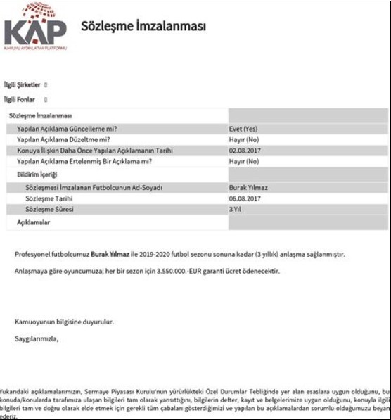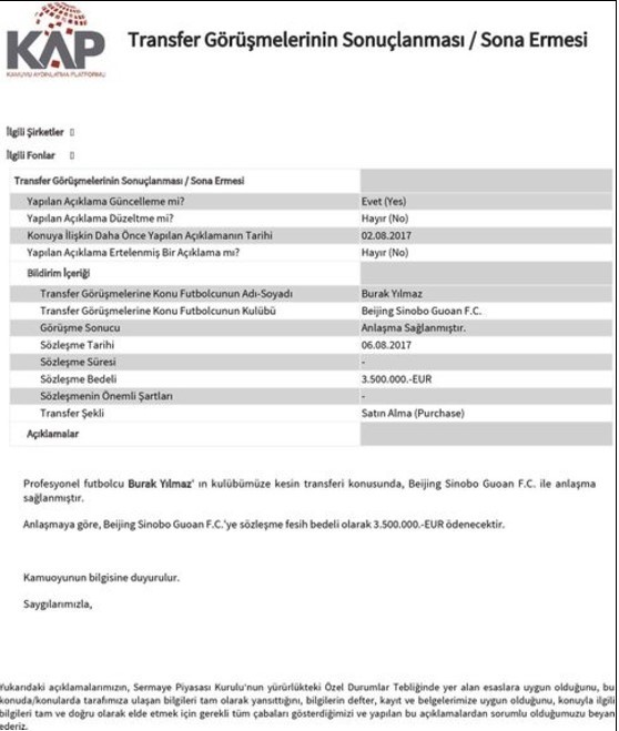 "Profesyonel futbolcu Burak Yılmaz’ın kulübümüze transferi konusunda, Beijing Sinobo Guoan F.C. ile anlaşma sağlanmıştır. Profesyonel futbolcumuz Burak Yılmaz ile 2019-2020 futbol sezonu sonuna kadar (3 yıllık) anlaşma sağlanmıştır."