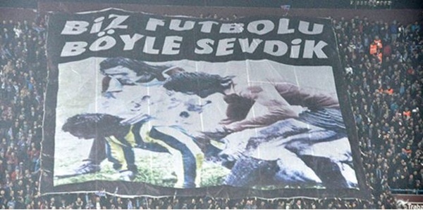 Trabzonsporlu oyuncuların sahadaki eylemi sırasında maraton tribününde de iki dev pankart açıldı. Pankartlardan birinde Fenerbahçeli bir futbolcuyu yerden kaldıran bordo mavili futbolcu görülürken bu fotoğrafın altına, “Biz futbolu böyle sevdik” yazıldı.