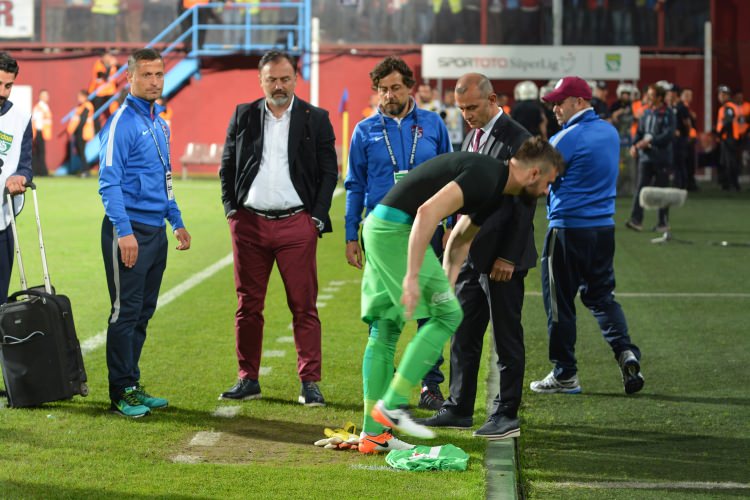 Trabzonspor-Fenerbahçe maçının, sahaya taraftarlar girmesi nedeniyle durması sonrası Onur Kıvrak şok bir hareket yaptı.