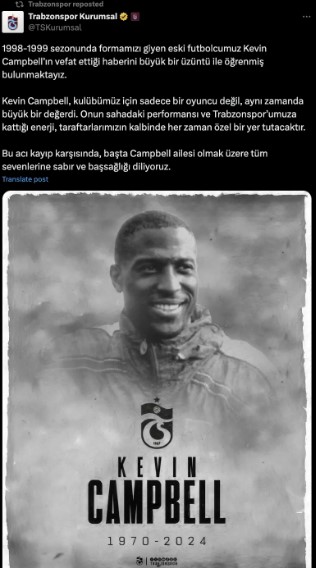 Trabzonspor Kulübü, eski futbolcusu Kevin Campbell'ın vefatı dolayasıyla başsağlığı mesajı yayımladı.