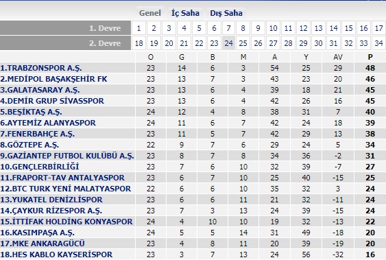Süper Lig’de heyecan tüm hızıyla devam ediyor. Ligin 24. haftasında Trabzonspor evinde Çaykur Rizespor’u 5-2 mağlup etti. Bu sonucun ardından futbolseverler puan durumunu araştırmaya başladı. İşte, detaylar…