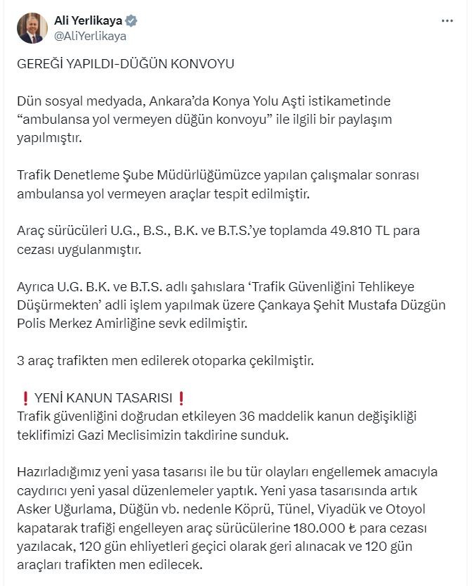 Bakan Yerlikaya, sosyal medya hesabından yaptığı açıklamada, dün sosyal medyada, Ankara'da 'ambulansa yol vermeyen düğün konvoyu' ile ilgili bir paylaşım yapıldığını ifade etti. Trafik Denetleme Şube Müdürlüğü tarafından yapılan çalışmalar sonrası ambulansa yol vermeyen araçların tespit edildiğini belirten Yerlikaya, "Araç sürücüleri U.G., B.S., B.K. ve B.T.S.'ye toplamda 49 bin 810 TL para cezası uygulanmıştır. Ayrıca U.G., B.K. ve B.T.S. adlı şahıslara 'Trafik Güvenliğini Tehlikeye Düşürmekten' adli işlem yapılmak üzere Çankaya Şehit Mustafa Düzgün Polis Merkez Amirliğine sevk edilmiştir. 3 araç trafikten menedilerek otoparka çekilmiştir" dedi.