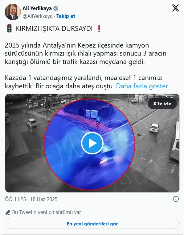 Bakan Yerlikaya, 2025 yılında Antalya'nın Kepez ilçesinde yaşanan elim bir trafik kazasını örnek gösterdi. Kamyon sürücüsünün kırmızı ışık ihlali yapması sonucu 3 aracın karıştığı kazada, 1 vatandaşımızın hayatını kaybettiğini, 1 vatandaşımızın da yaralandığını bildiren Yerlikaya, "Bir ocağa daha ateş düştü." ifadelerini kullandı.