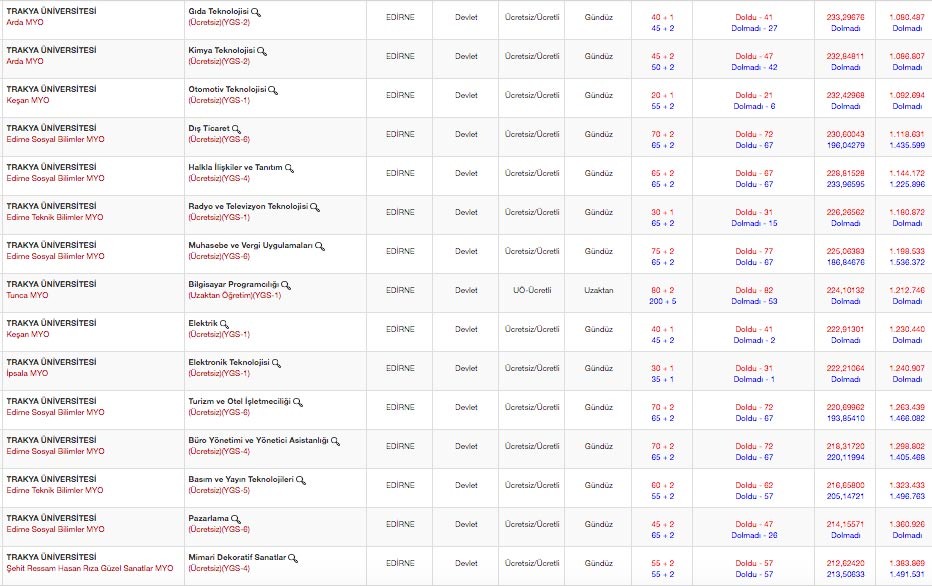 Trakya Üniversitesi YÖK atlas puanları için tıklayınız