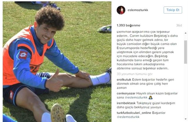 ''Önümüzdeki 1.5 sezon geçici olarak B.B Erzurumspor kulübüyle anlaşmış bulunmaktayım, bu transferde sayın başkanım Fikret Orman'a ve Erzurumspor kulübü Başkan'ı Ali Demirhan Başkan'ıma çok teşekkür ederim.. Canım kulübüm Beşiktaş'a daha güçlü daha hazır gelmek adına, bir büyük camiadan diğer büyük camia olan Erzurumsporda hedeflediği yere ulaştırmak için elimden geleni yapmak için mücadele edeceğim..Beşiktaş kulübümde bana emeği geçen tüm hocalarıma takım arkadaşlarıma abilerime sonsuz teşekkür ederim..''