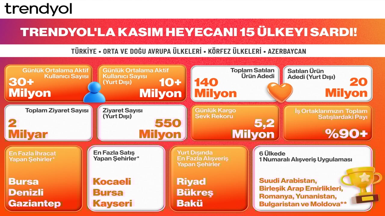 Trendyol, kasım kampanyalarıyla 15 ülkede satış rekoru kırdı. Günlük 5.2 milyon kargo sevkiyatı ve 140 milyon ürün satışı gerçekleştirilirken günlük ortalama aktif kullanıcı sayısı ise 30 milyonu aştı.