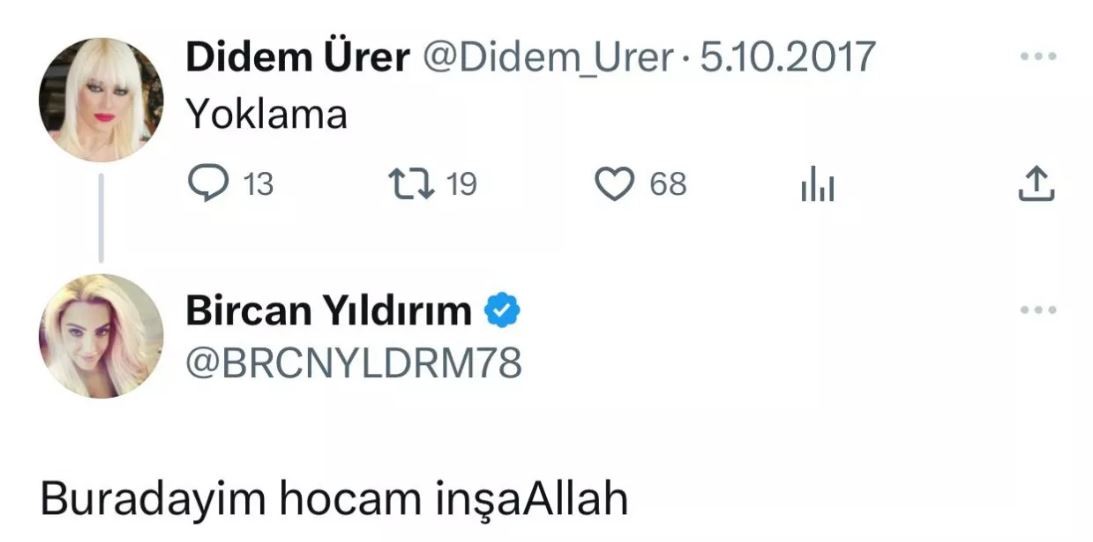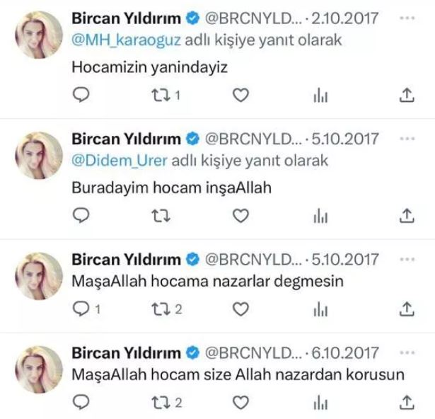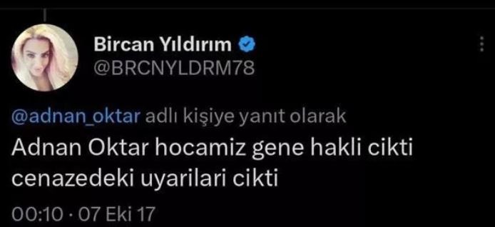Bircan Yıldırım'ın "Adnan Oktar hocam gene haklı çıktı cenazedeki uyarıları doğru çıktı", "Hocamızın yanındayız", "Maşallah hocama nazarlar değmesin" başlıklı Adnan Oktar silahlı suç örgütüne bağlı olduğunu gösteren bazı paylaşımlar yaptığı görüldü.