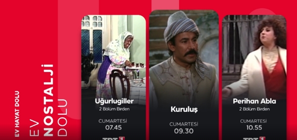 Her gün birçok yapım aralıklarla TRT kanallarında ekrana gelirken, cumartesi günleri "Nostaljik Diziler Günü" başlığı altında "Uğurlugiller", "Kuruluş", "Perihan Abla", "Gülşen Abi", "Yedi Numara" ve "Yeditepe İstanbul" dizileri TRT 1'de ara verilmeden izleyici ile buluşacak.