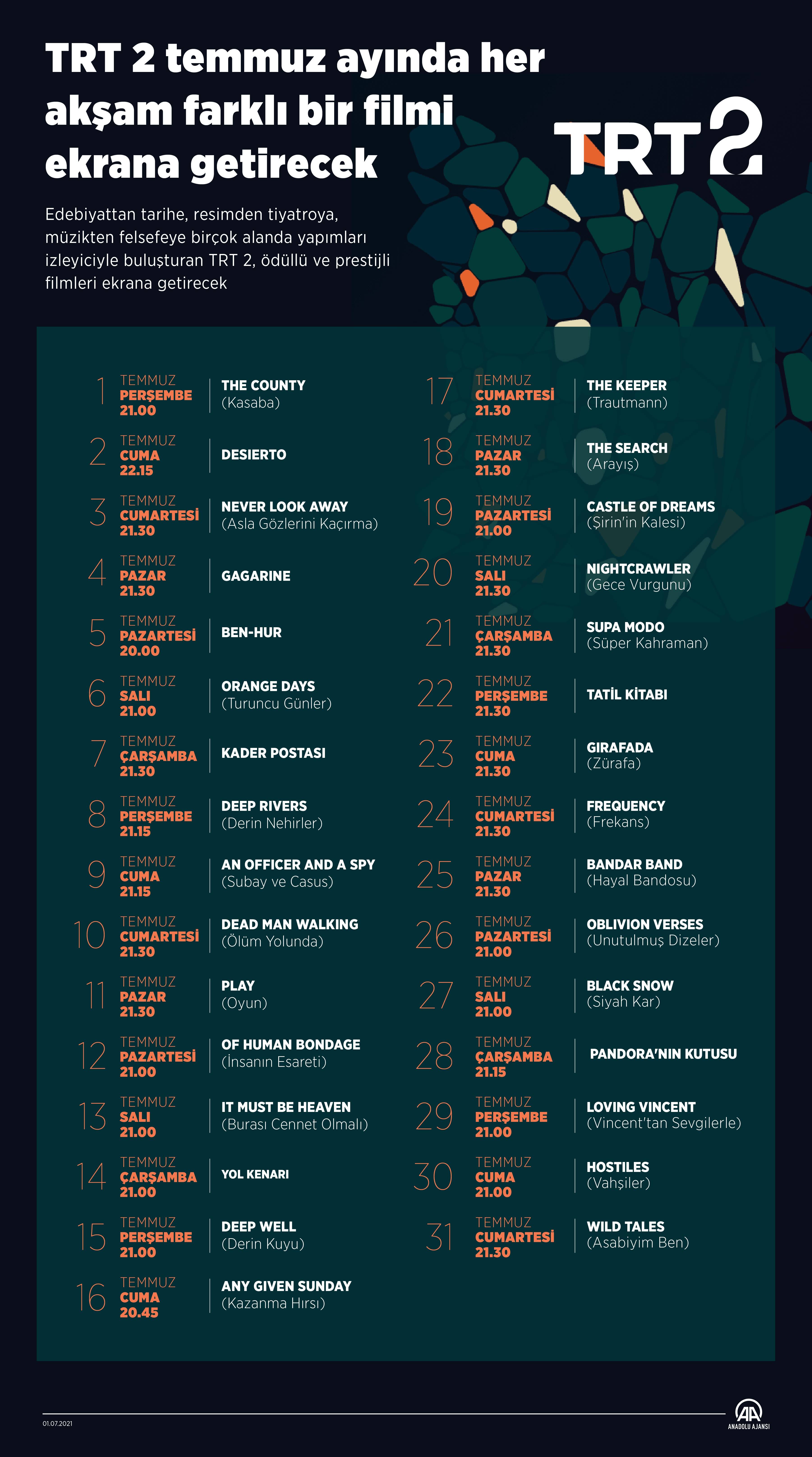 Kültür sanat kanalı TRT 2, temmuz ayı boyunca her akşam farklı bir filmi sinemaseverlerin ve izleyicilerin beğenisine sunacak.