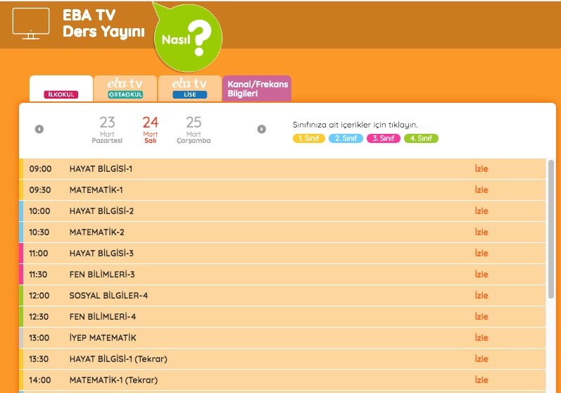 TRT izle, TRT canlı izle TRT aramaları son iki gündür milyonlarca öğrenci ve veliler tarafından uzaktan eğitim EBA TV nedeniyle sıklıkla aranmakta. Koronavirüs tedbirleri kapsamında ilkokul, ortaokul ve lise öğrencileri uzaktan eğitimlerini TRT EBA TV kanalı aracılığıyla gerçekleştirmekte. İşte TRT canlı EBA TV ders programı ilkokul, ortaokul ve lise ders saatleri, EBA TV ders tekrarları.