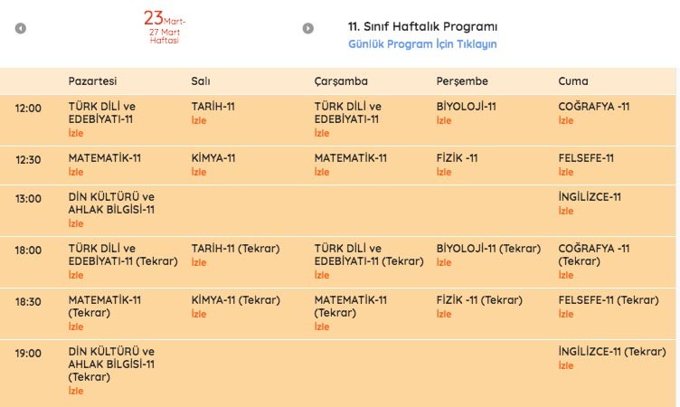 Eğitim öğretimini ortaokulda sürdüren öğrenciler için 23-27 Mart uzaktan eğitim ders programı ve 24 Mart EBA TV 11. sınıf çarşamba ders programı şöyle: