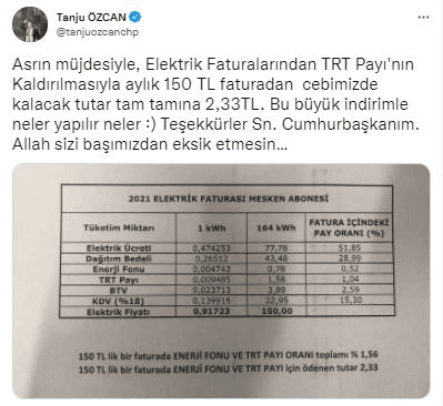 Sosyal medya hesabından paylaşımda bulunan Bolu Belediye Başkanı Tanju Özcan, “Asrın müjdesiyle, Elektrik Faturalarından TRT Payı'nın Kaldırılmasıyla aylık 150 TL faturadan cebimizde kalacak tutar tam tamına 2,33TL. Bu büyük indirimle neler yapılır neler :) Teşekkürler Sn. Cumhurbaşkanım. Allah sizi başımızdan eksik etmesin…” şeklinde konuştu.