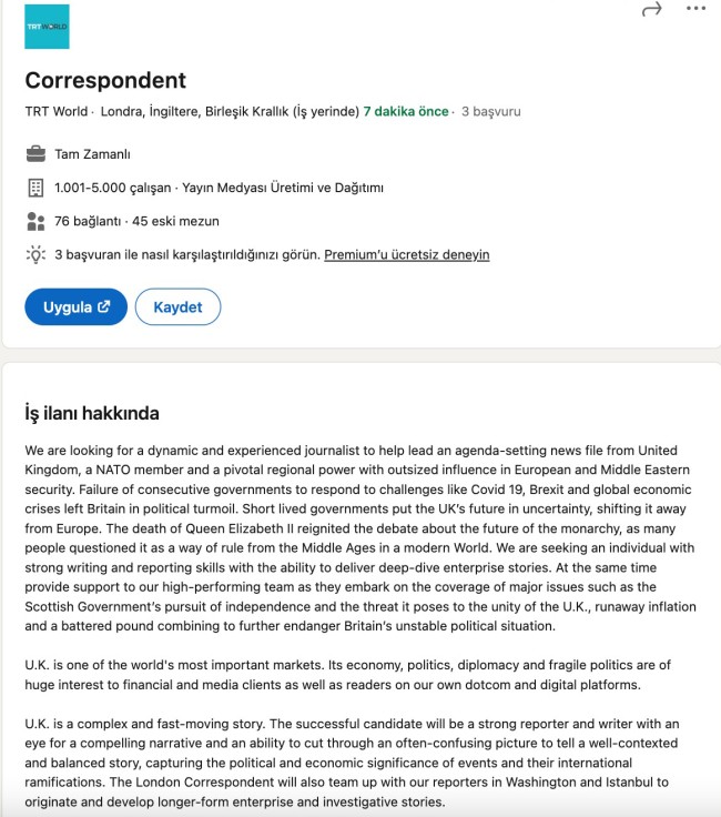 TRT World’ün “Art arda gelen Britanya hükümetlerinin COVID-19 salgını, Brexit, küresel ekonomik kriz gibi büyük meydan okumalara yanıt vermekte başarısız olması İngiliz siyasetini bir karmaşa içine soktu. Kısa süreli İngiliz hükümetleri ülkenin geleceğini belirsizlik içinde bırakıyor ve İngiltere’yi Avrupa’dan uzaklaştırıyor. Kraliçe Elizabeth’in ölümüyle birlikte, Orta Çağ’dan kalma bir yönetim biçimi olarak Kraliyet’in modern çağda varlığı tartışmaları hız kazandı. Bu konularda kapsamlı haberler yapabilecek, kalemi kuvvetli muhabirlere ihtiyacımız var,” ifadelerinin yer aldığı ilanı, sadece Türkiye’de değil, yurtdışında da yankı buldu.