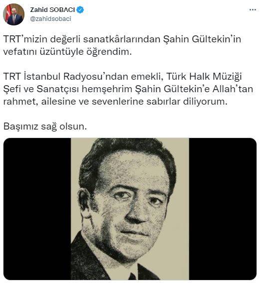 Sobacı, "TRT’mizin değerli sanatkârlarından Şahin Gültekin’in vefatını üzüntüyle öğrendim. TRT İstanbul Radyosu’ndan emekli, Türk Halk Müziği Şefi ve Sanatçısı hemşehrim Şahin Gültekin’e Allah’tan rahmet, ailesine ve sevenlerine sabırlar diliyorum. Başımız sağ olsun." dedi.