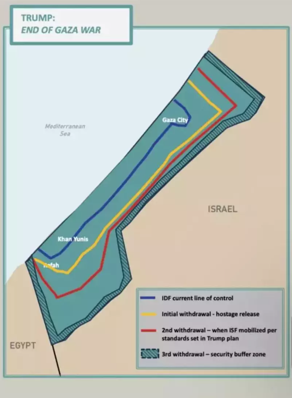 Eğer Hamas tarafından kabul edilirse bu teklif 72 saat içerisinde tüm geri kalan rehinelerin derhal serbest bırakılmasını içeriyor. İsrail'in ordusu tüm saldırılarını durduracak ve kademeli olarak geri çekilecek. Bu çabaların başarıya ulaşması için yeni bir uluslararası denetim kurumu kurulacak. Bir Barış Kurulu diyoruz.